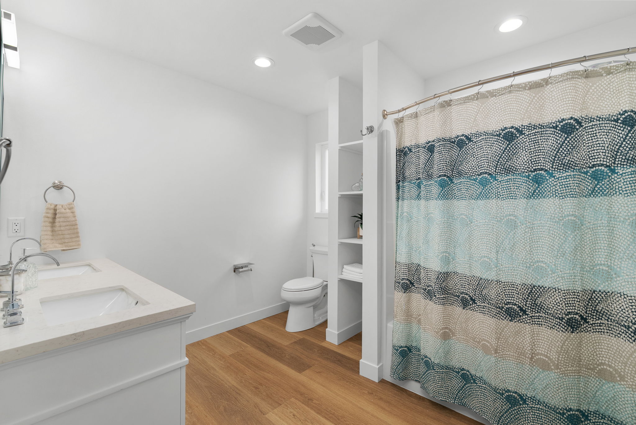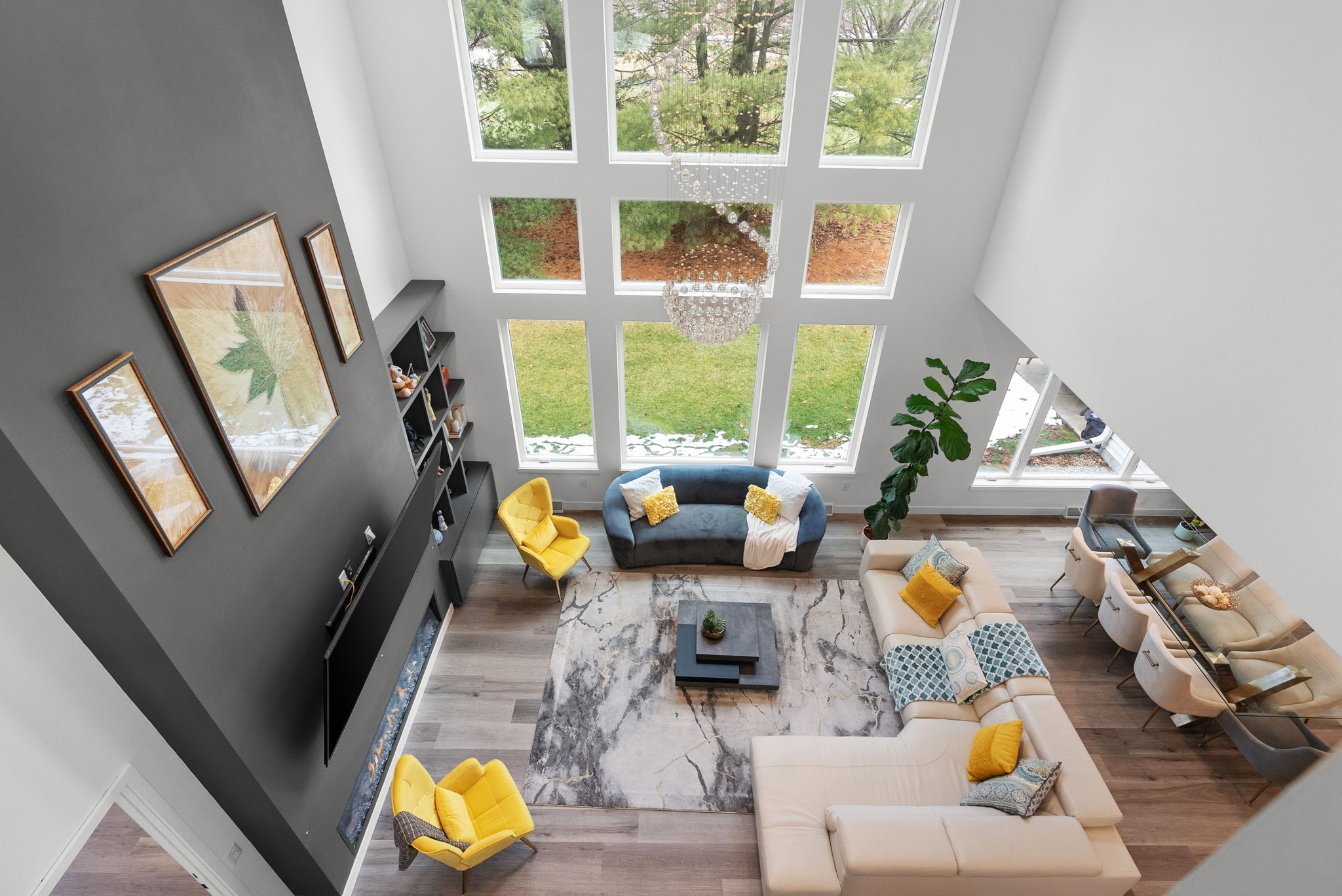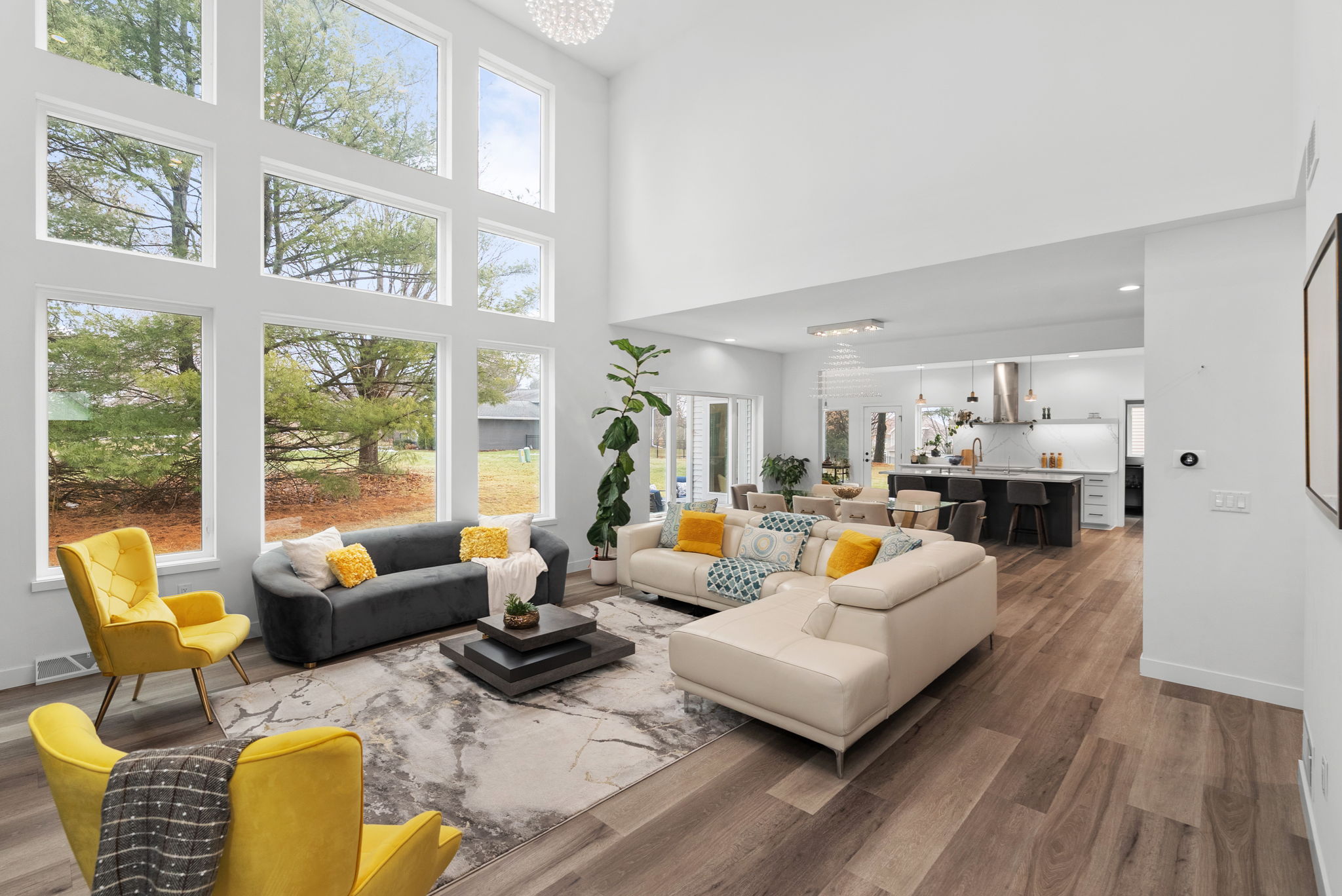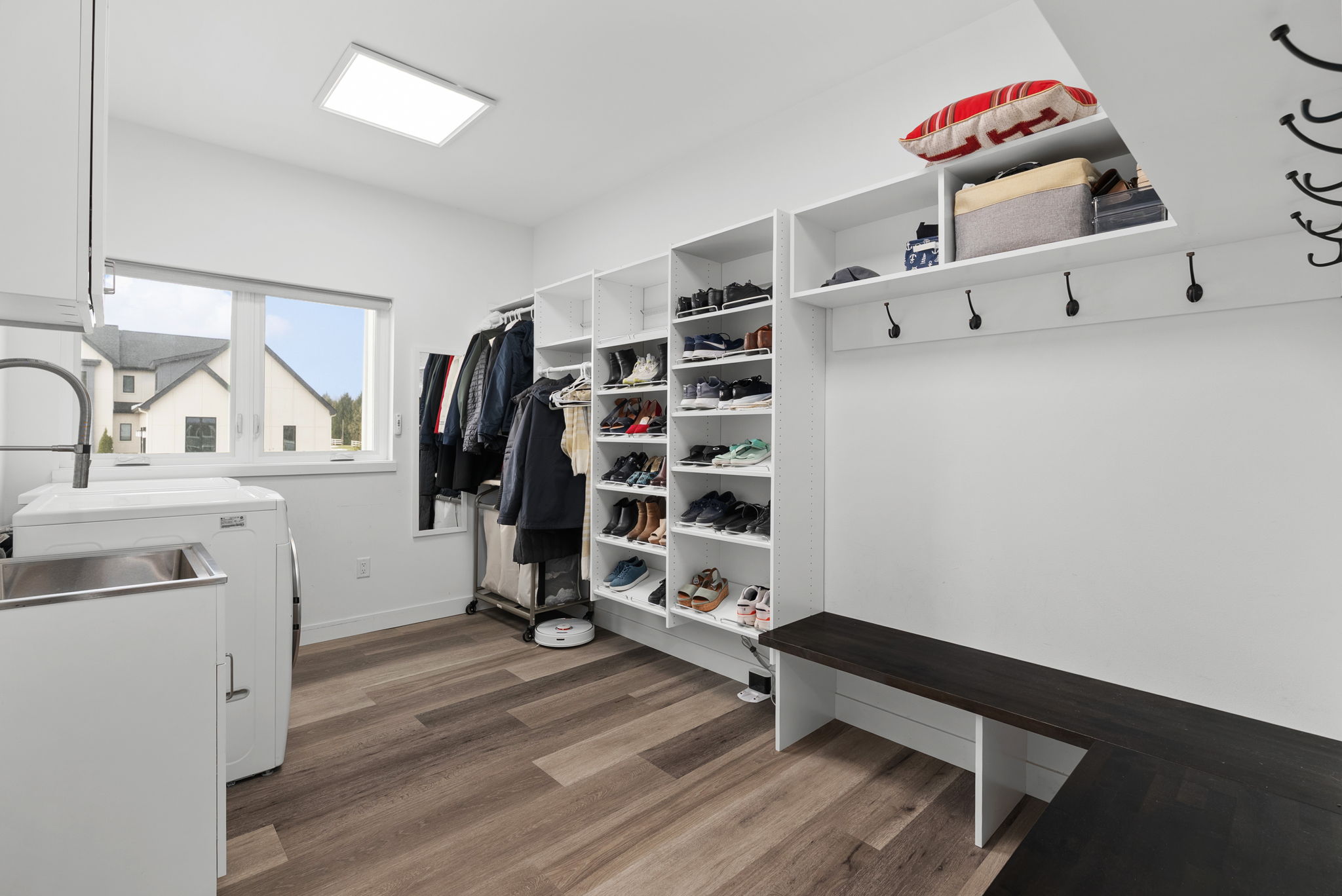 The soaring great room is filled with natural light from a dramatic wall of windows overlooking the backyard and mature pines—ideal for both entertaining and everyday relaxation. The main level is thoughtfully designed for comfort and convenience, featuring a private office and a spacious primary suite retreat complete with a large walk-in closet and a spa-inspired bathroom with heated floors, dual-headed showers, and a luxurious soaking tub.