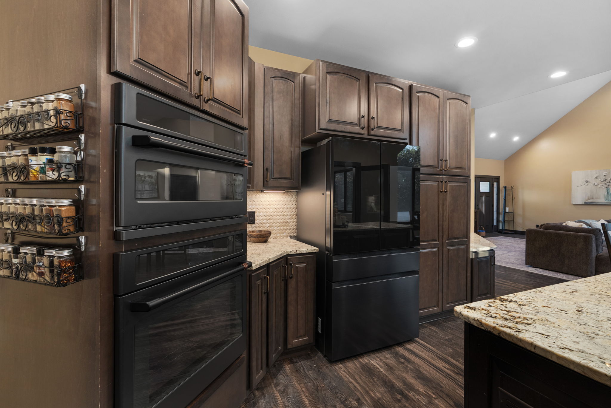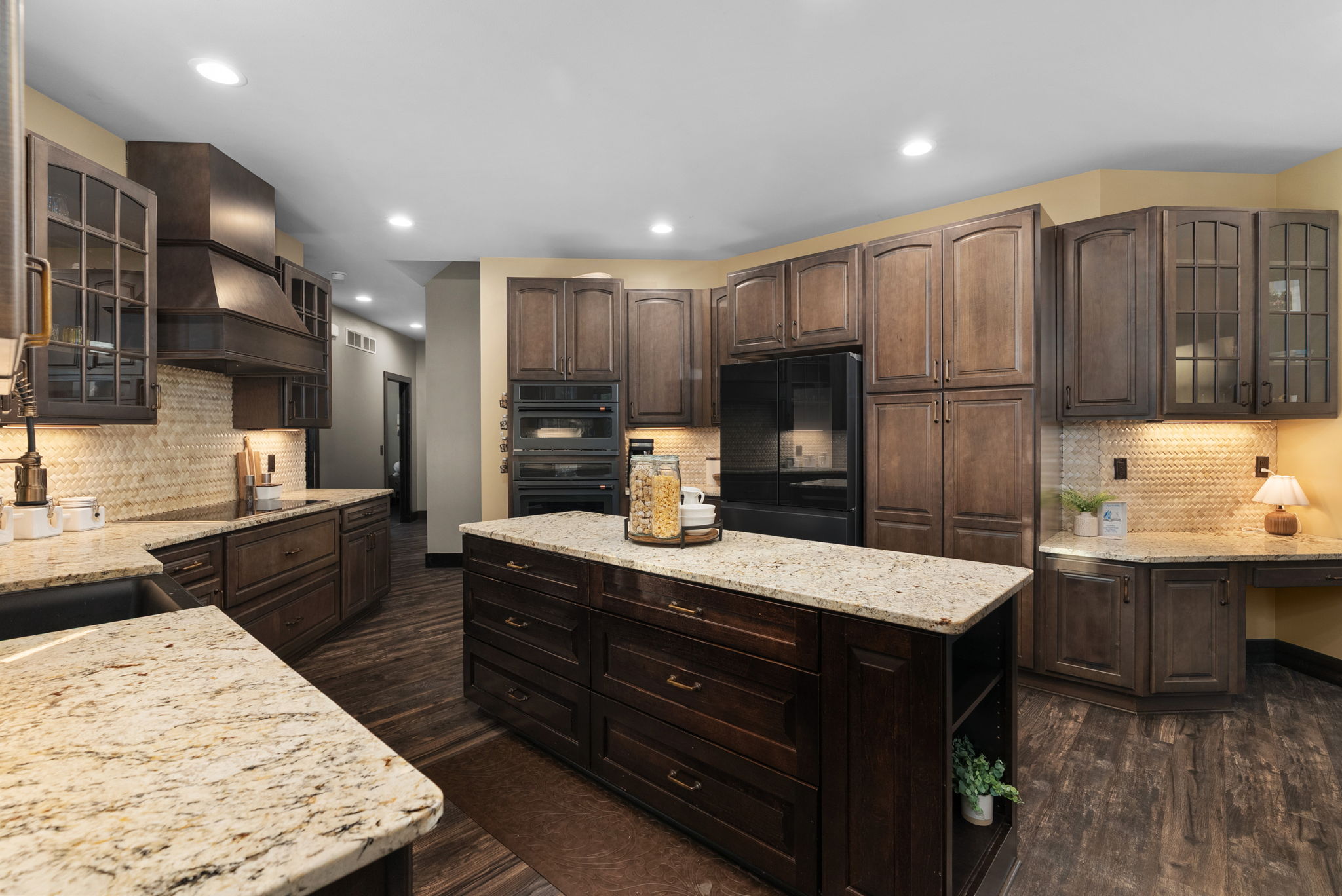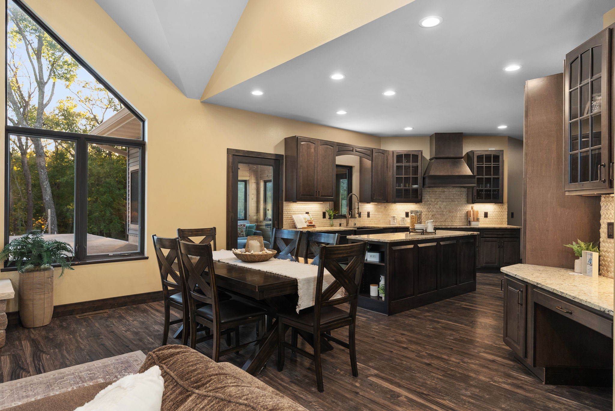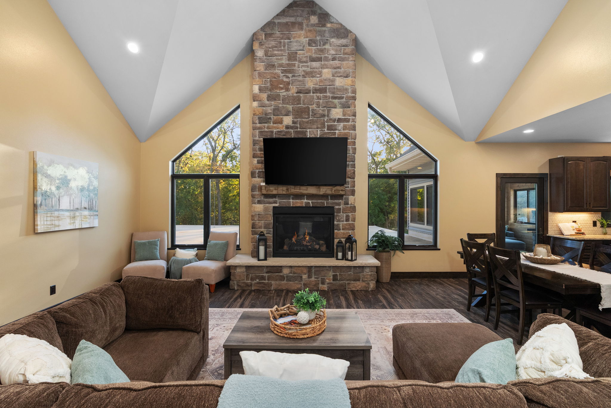 Inside, tall vaulted ceilings and a floor-to-ceiling brick fireplace create a grand yet welcoming living area, open to a beautiful kitchen with granite countertops, large island, and abundant cabinetry. The main-level primary suite features dual walk-in closets and a spa-inspired bath with jetted tub, separate shower, and dual vanities. A four-season sunroom offers views of the tree-lined backyard and access to the stairs to patio.