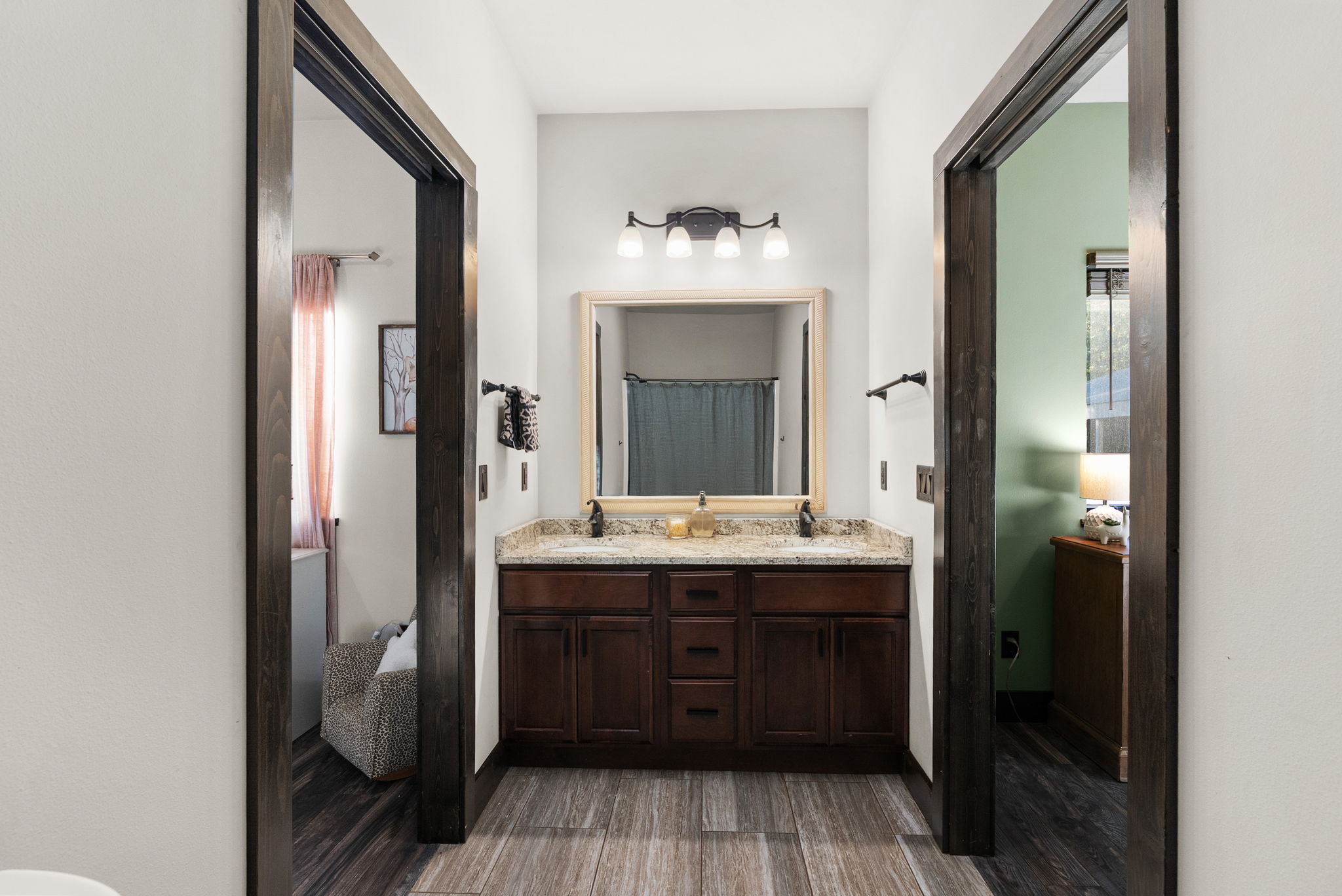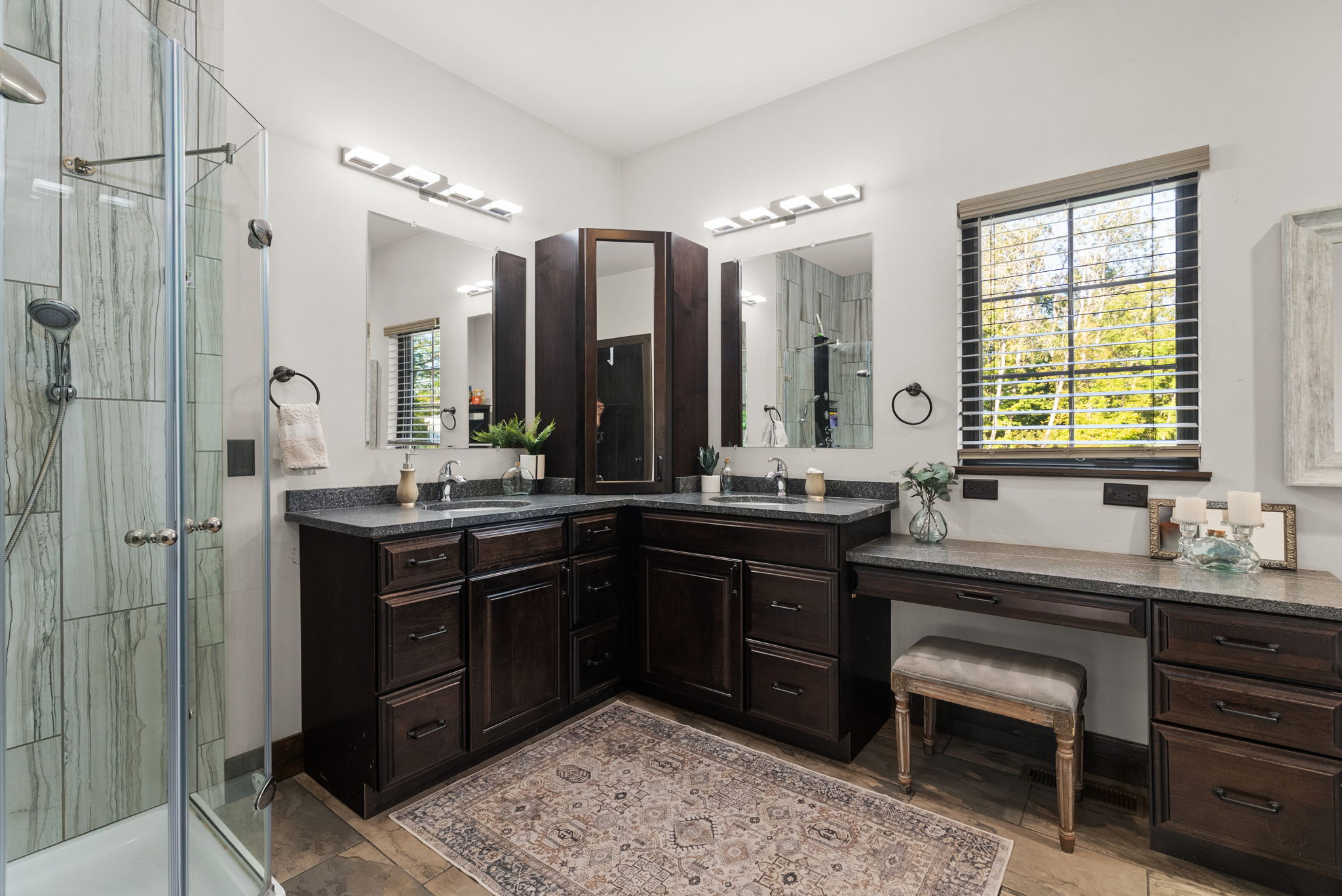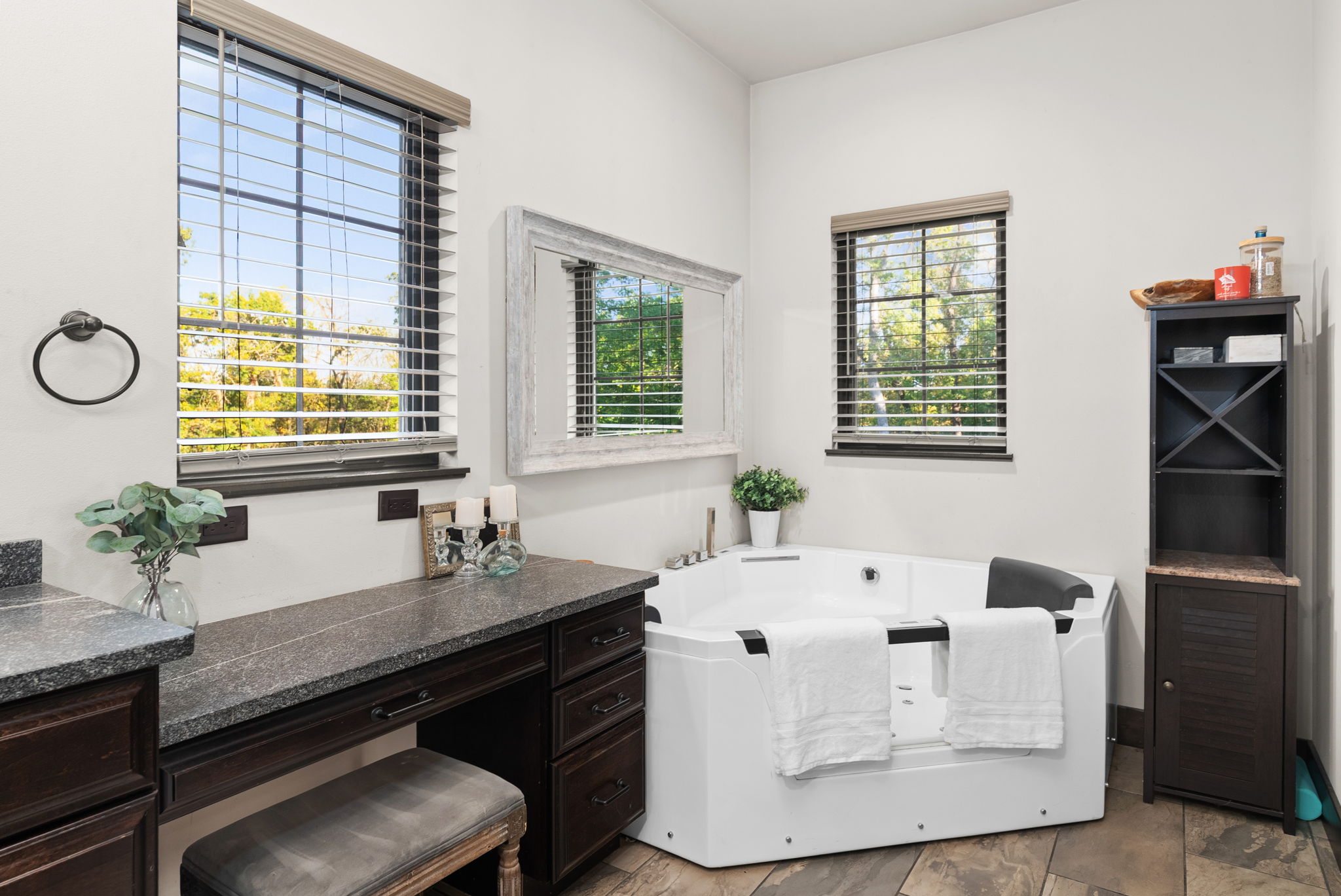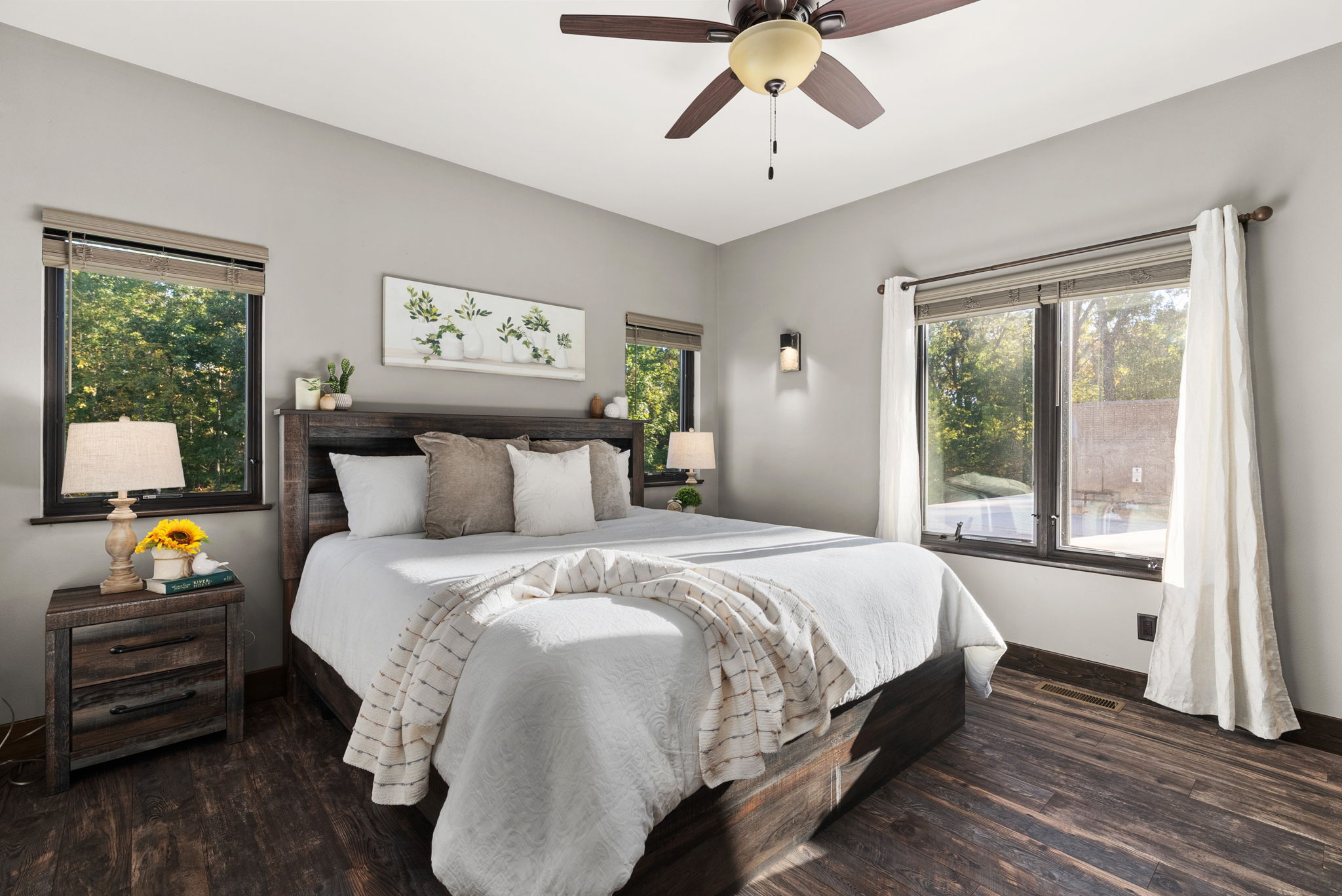 Inside, tall vaulted ceilings and a floor-to-ceiling brick fireplace create a grand yet welcoming living area, open to a beautiful kitchen with granite countertops, large island, and abundant cabinetry. The main-level primary suite features dual walk-in closets and a spa-inspired bath with jetted tub, separate shower, and dual vanities. A four-season sunroom offers views of the tree-lined backyard and access to the stairs to patio.
