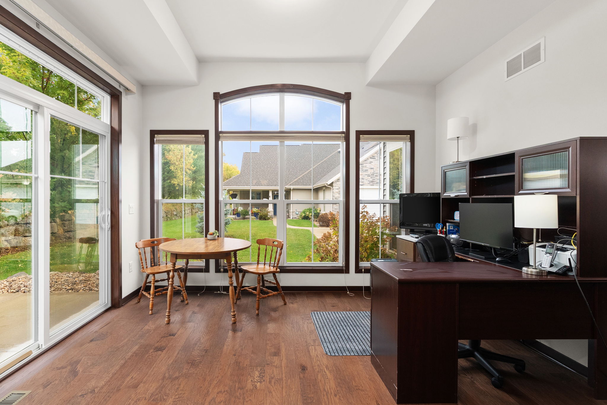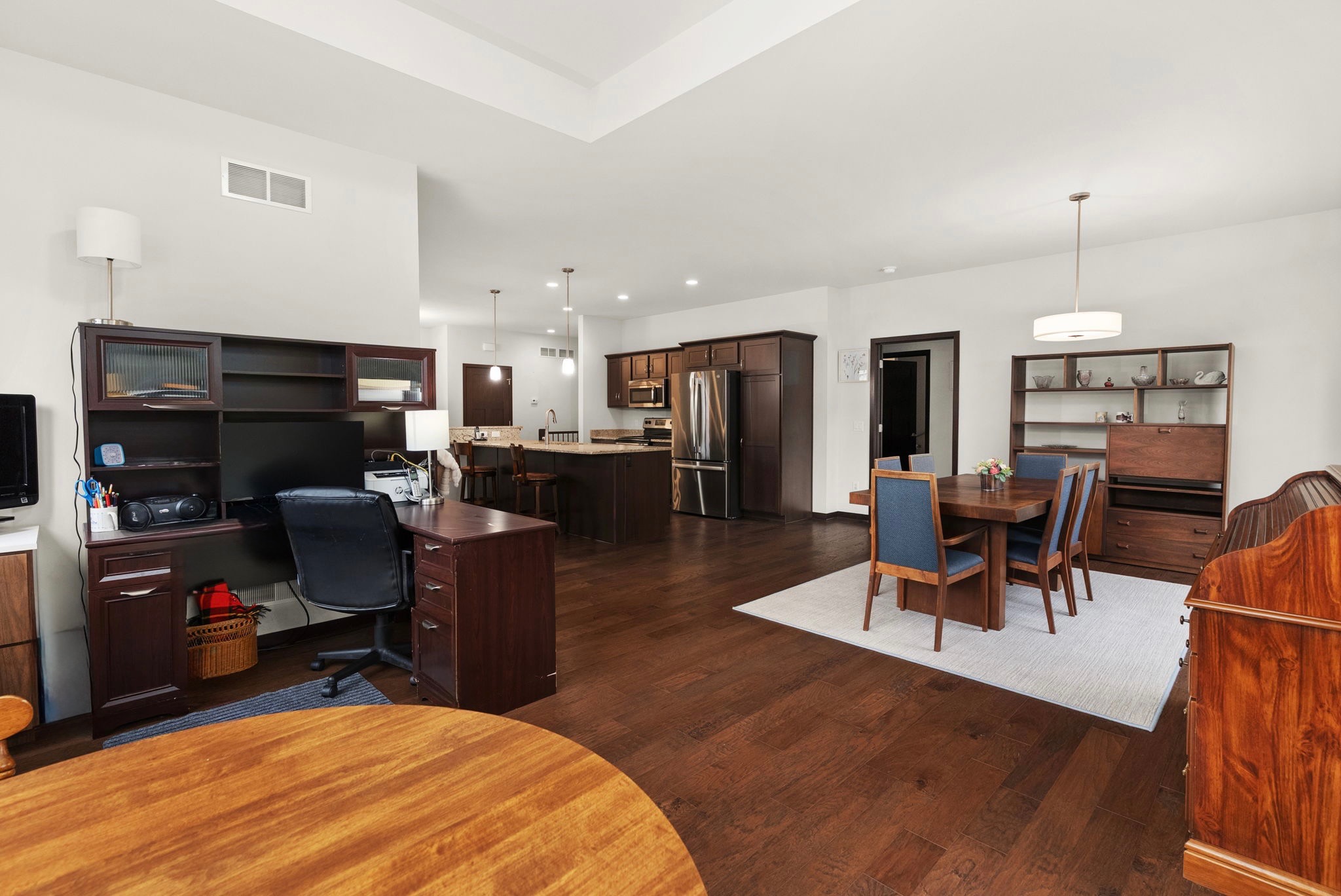 Sunlight fills the dining room and sunroom, which opens to a private patio overlooking green space — the perfect spot for morning coffee, evening unwinding, or casual gatherings with friends. The large primary suite offers a serene retreat with a double vanity, walk-in shower, and spacious walk-in closet. A second bedroom, full bath, and convenient laundry room complete the main level.