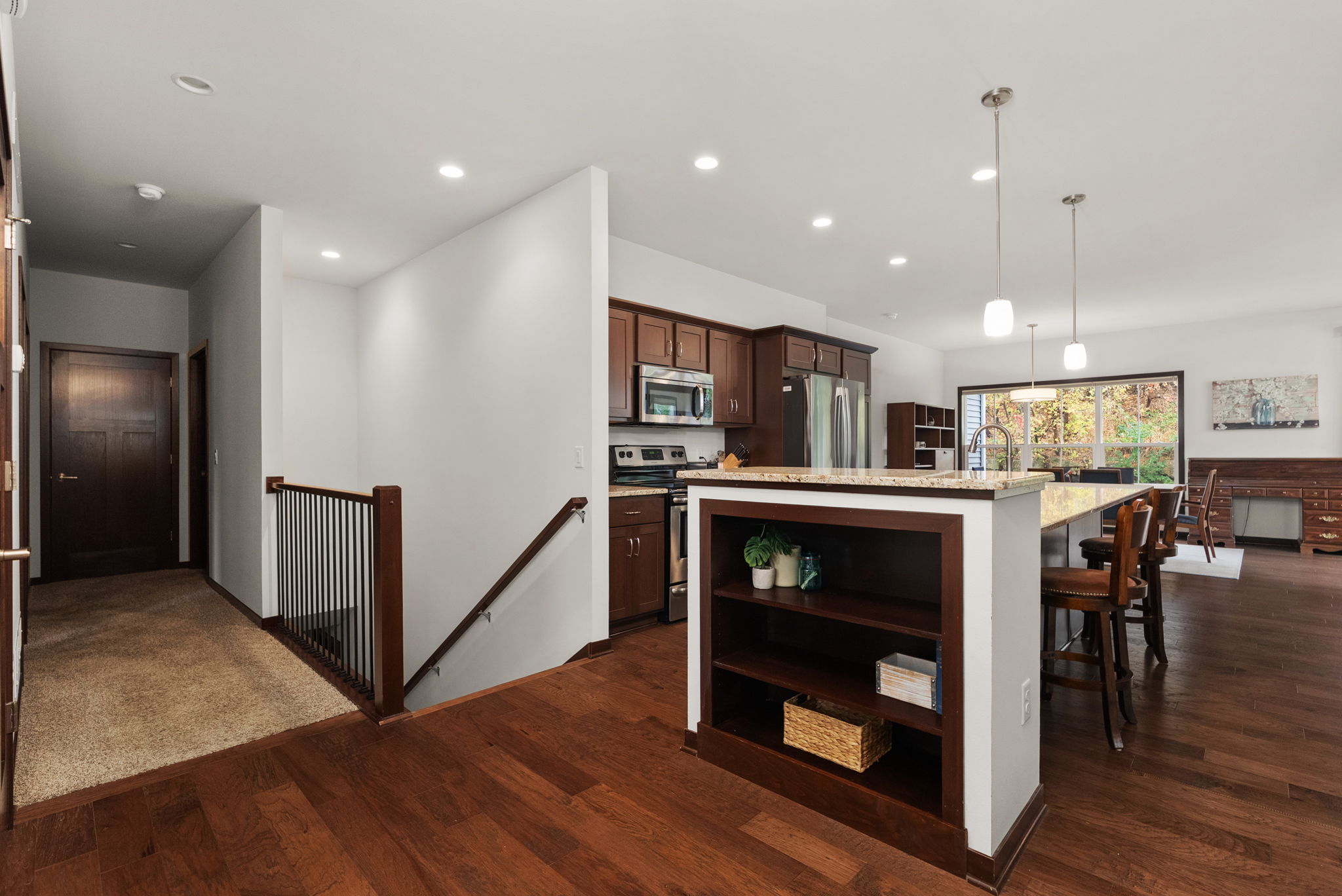 Step inside and be greeted by a bright, open layout with gleaming wood floors throughout. The living room, anchored by a cozy fireplace, creates a warm and inviting space for relaxing or entertaining. At the heart of the home, the kitchen features an island with a breakfast bar, making it easy to prepare meals while staying connected to family and guests.