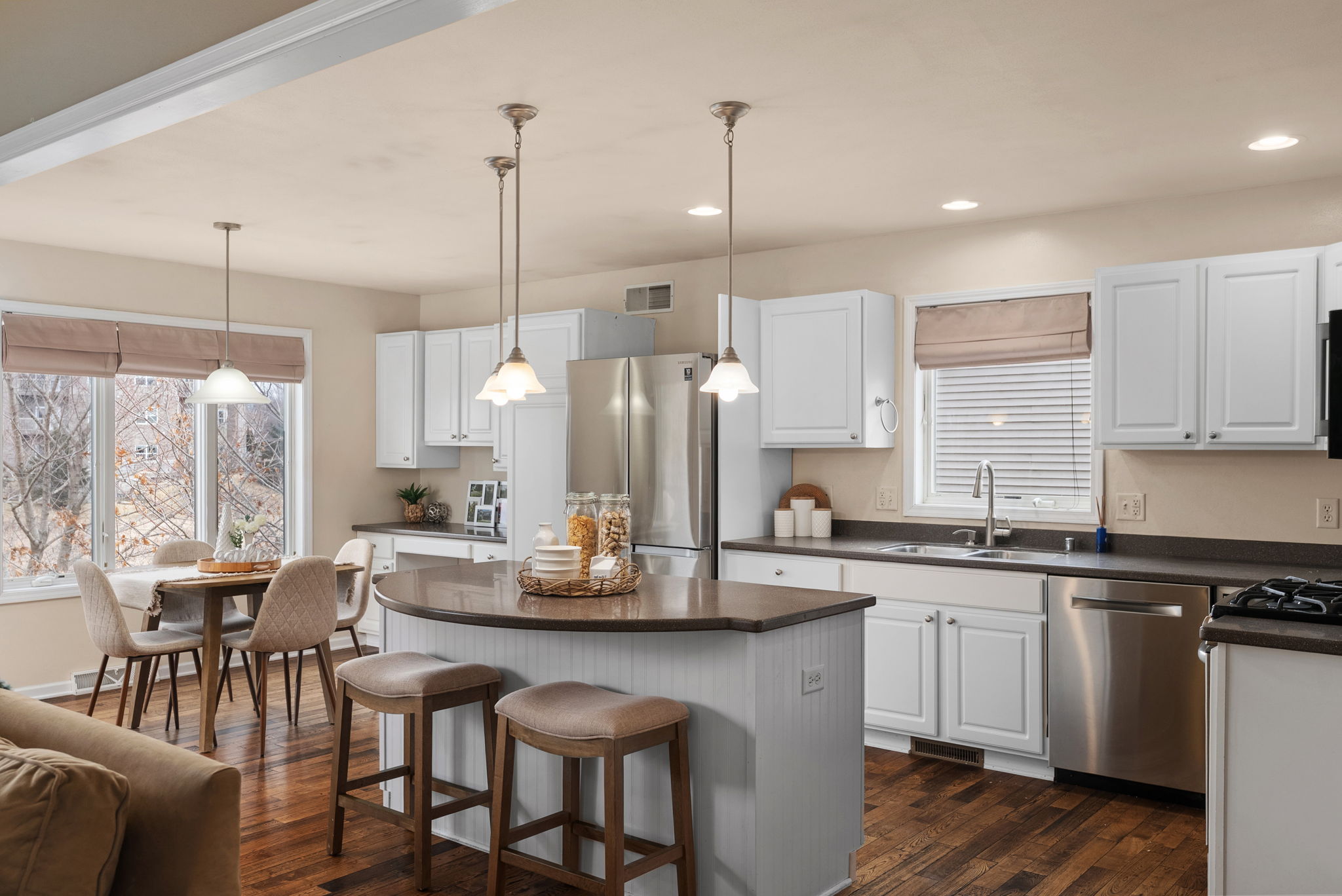 Enjoy easy living in this ranch-style home moments from shopping, dining, scenic bike trails, and minutes from Fitchburg and Verona. Backing to a peaceful greenway, this home offers privacy and open views that are hard to come by. The main level features an open-concept layout where the kitchen flows seamlessly into the living room, complete with a gas fireplace for cozy nights in. The kitchen includes an island with breakfast bar, ideal for casual meals or entertaining. Step from the dining area onto the newer deck and enjoy a backyard that faces green space, not neighbors. The large primary suite offers a walk-in closet and private bath with double vanity, while 2 additional bedrooms, a full bath, and convenient main-level laundry round out the main floor. Downstairs, the exposed lower level is built for fun and flexibility. With a full bath, bar area, and projector, it’s perfect for game days, movie nights, or hosting friends. A newer furnace adds peace of mind.